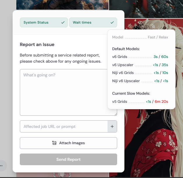 The reporting tool also has a quick view of https://status.midjourney.com/, allowing you to check on any ongoing issues before lodging a report.